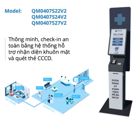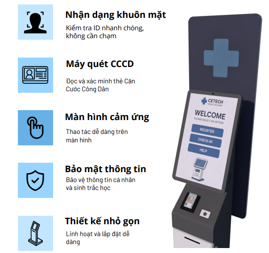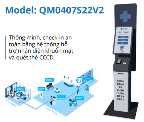 Kiosk đăng ký khám tự phục vụ hỗ trợ quét và đọc dữ liệu từ thẻ căn cước công dân (CCCD) gắn chip, kết hợp nhận diện khuôn mặt, giúp xác minh danh tính nhanh chóng, chính xác và không tiếp xúc. Thiết kế nhỏ gọn, thao tác dễ dàng, giúp rút ngắn thời gian đăng ký, giảm tải quầy tiếp nhận và nâng cao trải nghiệm cho bệnh nhân.